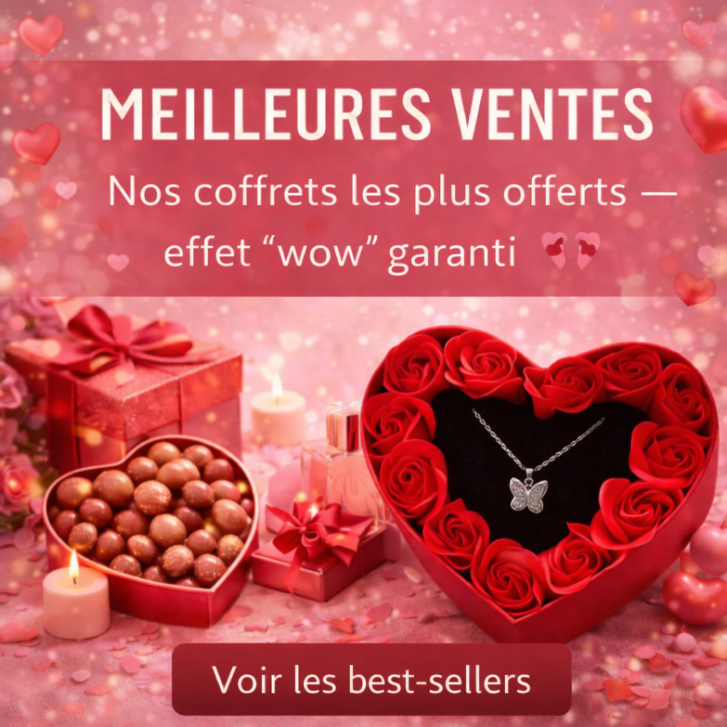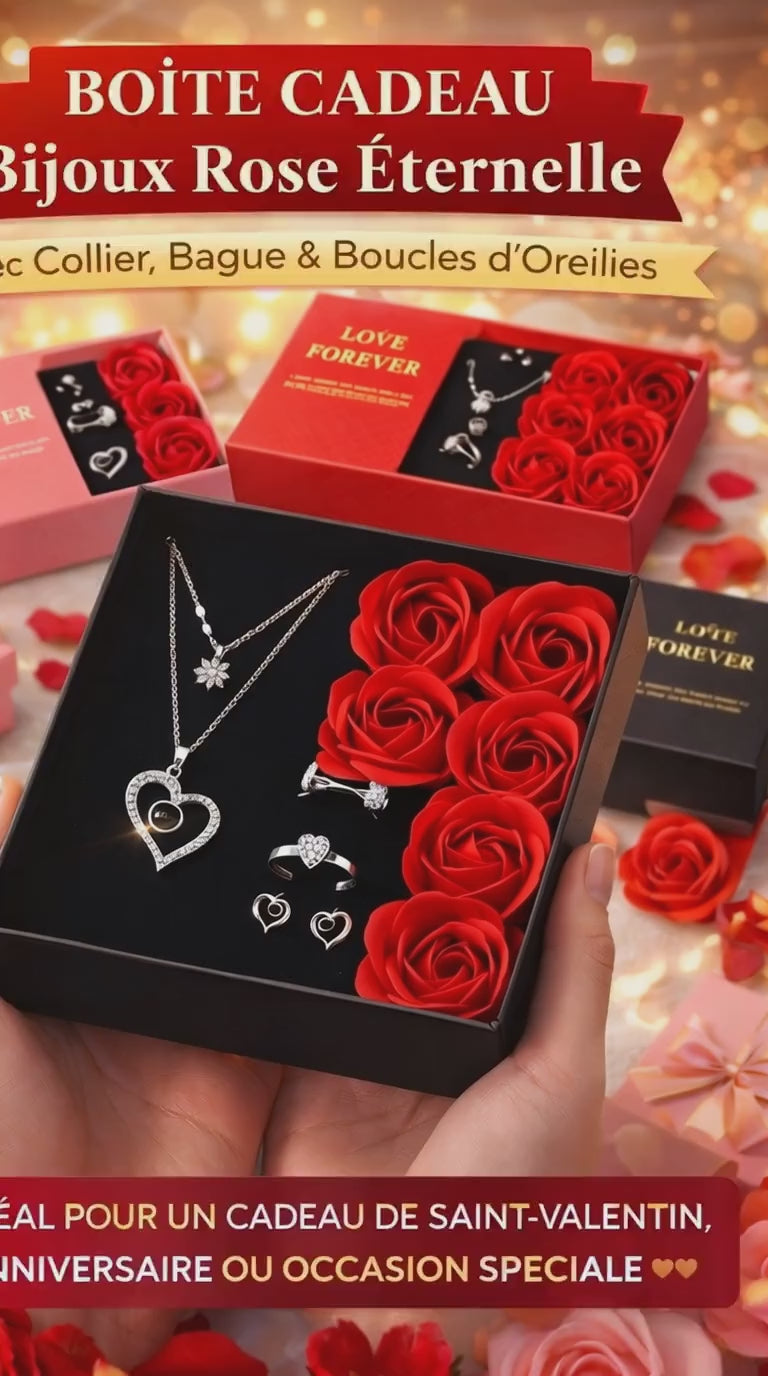 Montrez le cadeau en action — bijoux scintillants, roses éternelles et présentation premium pour un “wow” garanti.